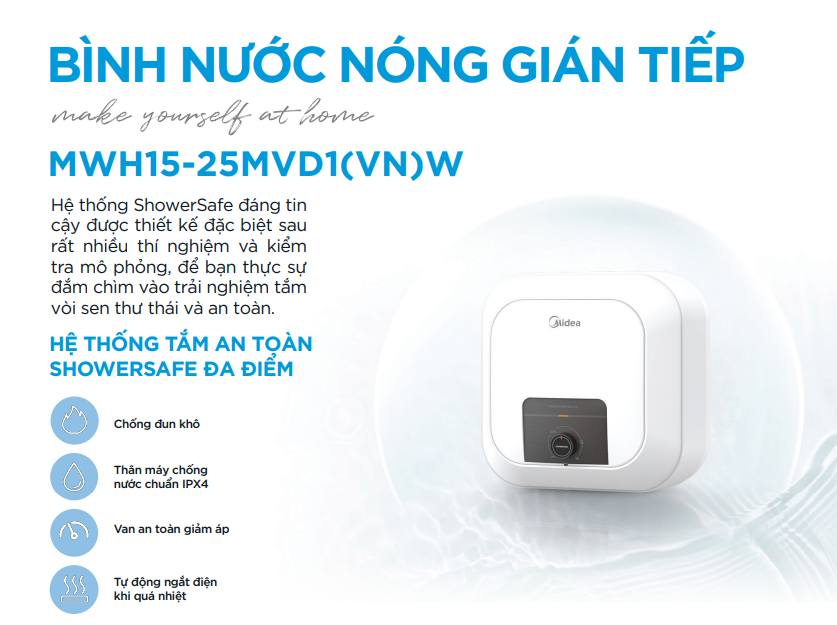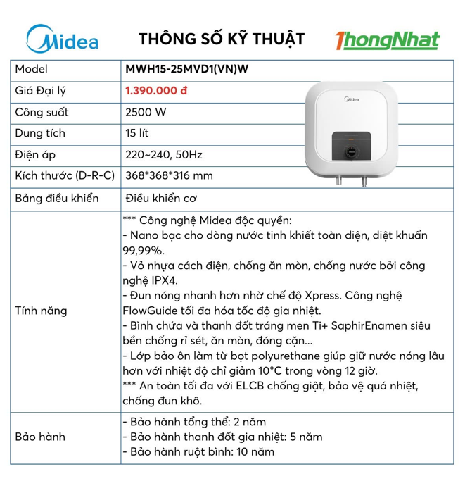 Bình nóng lạnh 15 lít Midea MWH15-25MVD1(VN)W (Bình vuông) là mẫu bình nhỏ gọn, phù hợp không gian phòng tắm hiện đại. Trang bị đầy đủ tính năng an toàn ELCB, rơ-le kép, Titanium siêu bền và cách nhiệt mật độ cao. Liên hệ Điện máy Dũng Vân – Quảng Ninh để được tư vấn, lắp đặt tận nơi và bảo hành chính hãng.