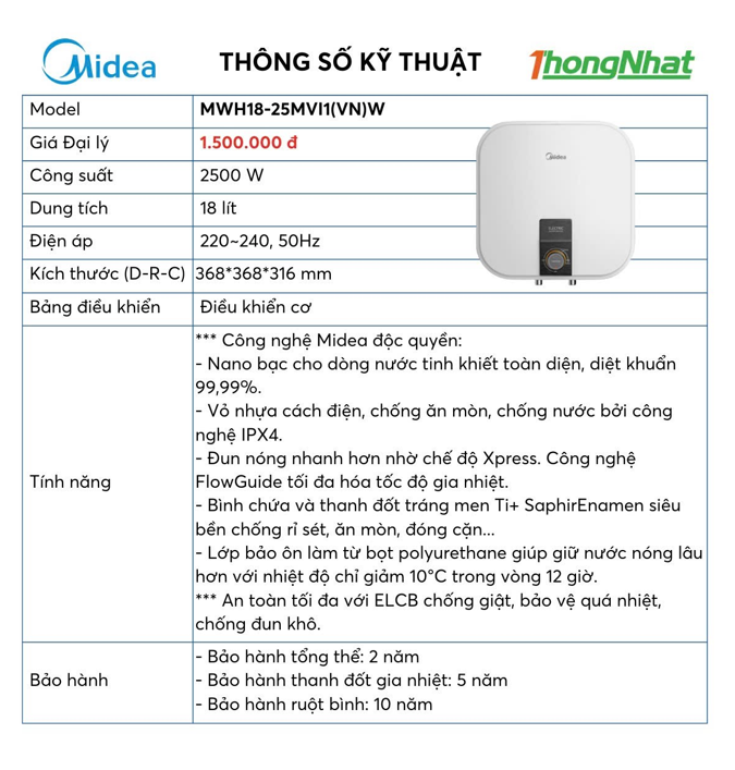 Bình nóng lạnh 18 lít Midea MWH18-25MVII(VN)W (Bình vuông) là mẫu bình nhỏ gọn, phù hợp không gian phòng tắm hiện đại. Trang bị đầy đủ tính năng an toàn ELCB, rơ-le kép, Titanium siêu bền và cách nhiệt mật độ cao. Liên hệ Điện máy Dũng Vân – Quảng Ninh để được tư vấn, lắp đặt tận nơi và bảo hành chính hãng.
