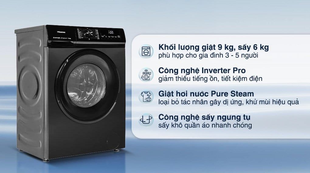- Máy giặt sấy lồng ngang Hisense Inverter giặt 9 kg - sấy 6 kg WD90N1Y
