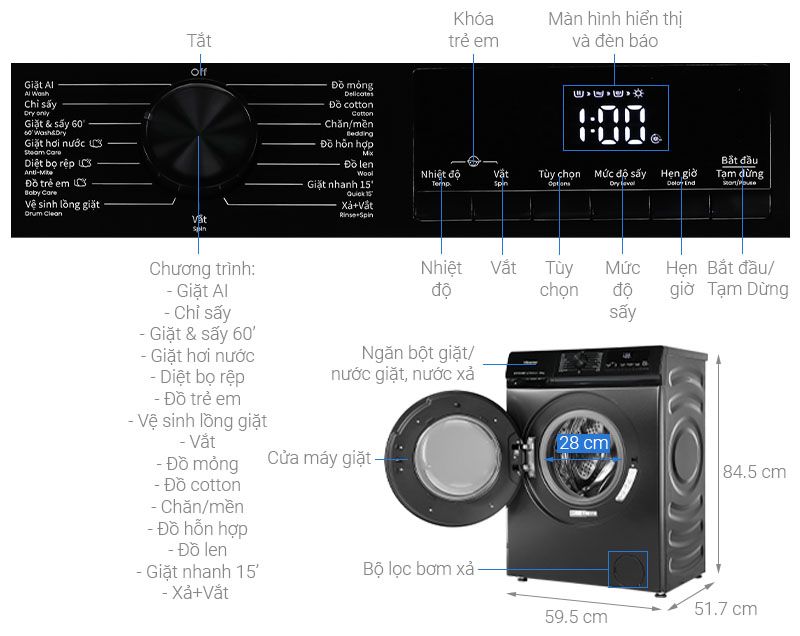 - Chương trình giặt & sấy nhanh 60 phút: Làm sạch và sấy khô tiện lợi trong ngày.