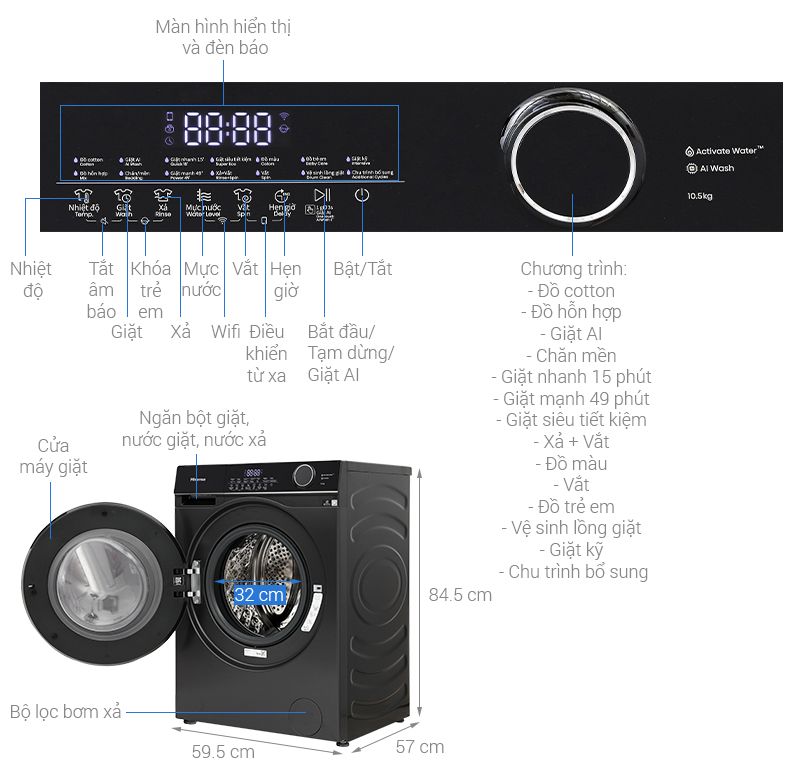 - Chương trình giặt: Đa dạng, đáp ứng mọi nhu cầu từ giặt nhanh, đồ trẻ em đến giặt tiết kiệm.