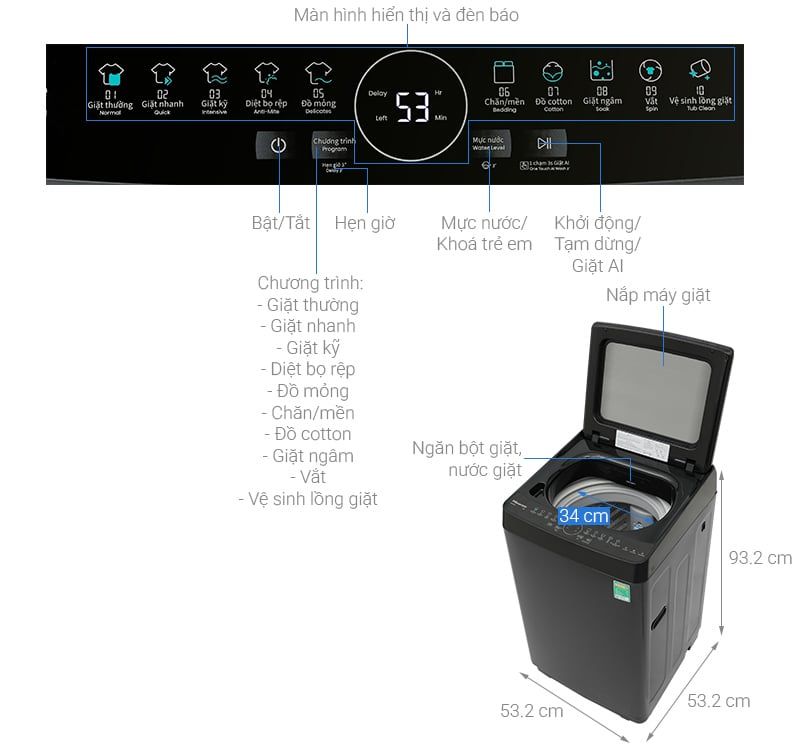 - Các tiện ích hữu ích: khóa trẻ em, hẹn giờ, tự vệ sinh lồng giặt.