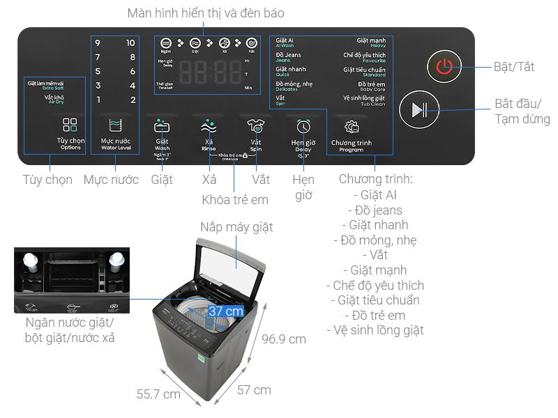 Khối lượng giặt 10.5 kg, đáp ứng nhu cầu cho gia đình từ 7 người trở lên. Máy tích hợp 10 chương trình giặt đa dạng: giặt thường, giặt nhanh, giặt mạnh, giặt AI, đồ trẻ em, giặt chăn mền,… giúp linh hoạt trong từng nhu cầu sử dụng.