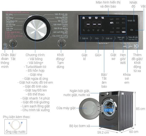 Với khối lượng giặt 10 kg, phù hợp cho gia đình từ 5 – 7 thành viên hoặc khoảng 15 – 16 bộ quần áo/lần giặt. Tích hợp sẵn 14 chương trình đa dạng: TurboWash 59, giặt hơi nước đồ trẻ em, giặt ngừa dị ứng, giặt nhanh 14 phút, giặt nhẹ, đồ tinh xảo, chăn ga, vệ sinh lồng giặt,…