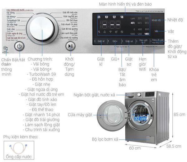 - Steam™: Loại bỏ 99,9% vi khuẩn và tác nhân gây dị ứng, giảm nhăn, bảo vệ sức khỏe gia đình.