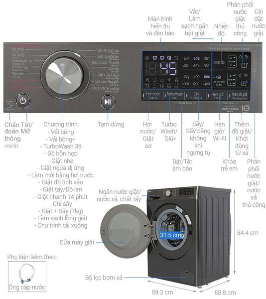 - TurboWash360: 4 vòi phun 3D áp lực lớn, giặt sạch nhanh chỉ trong 39 phút.