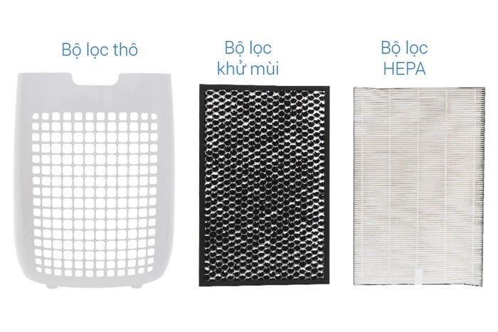 Máy được trang bị 3 lớp lọc gồm lưới lọc thô giúp giữ bụi lớn và lông thú, lớp than hoạt tính khử mùi hôi và bộ lọc HEPA có khả năng loại bỏ bụi mịn PM2.5, vi khuẩn và các tác nhân gây dị ứng.