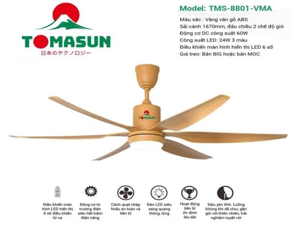 Quạt Trần đèn Tomasun TMS-8801-VMA, 6 cánh, sải cánh 1670mm, có khiển, đảo chiều 2 chế độ gió, màu vàng vân gỗ, PRC