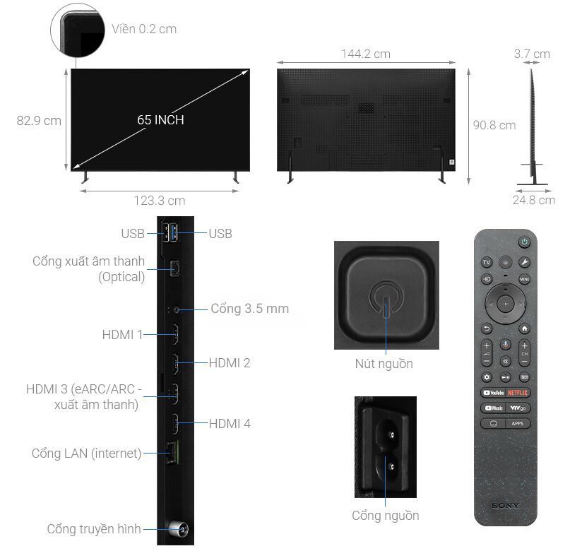 - Chiếc tivi Sony này mang phong cách tối giản nhưng không kém phần tinh tế, với đường viền siêu mỏng tạo nên hiệu ứng hình ảnh tràn viền, làm nổi bật nội dung trên màn hình.