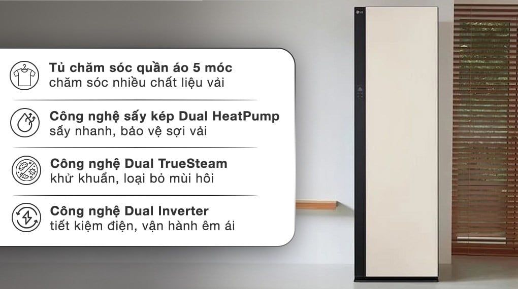 | Chương trình | Chăm sóc quần áo – Sấy khô – Hút ẩm – Diệt khuẩn – AutoFresh |