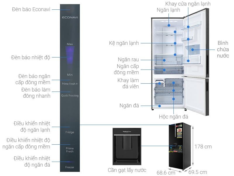 - Khay lấy nước ngoài: Dung tích 3 lít, kháng khuẩn, khử mùi carbon, vật liệu không chứa BPA an toàn sức khỏe.